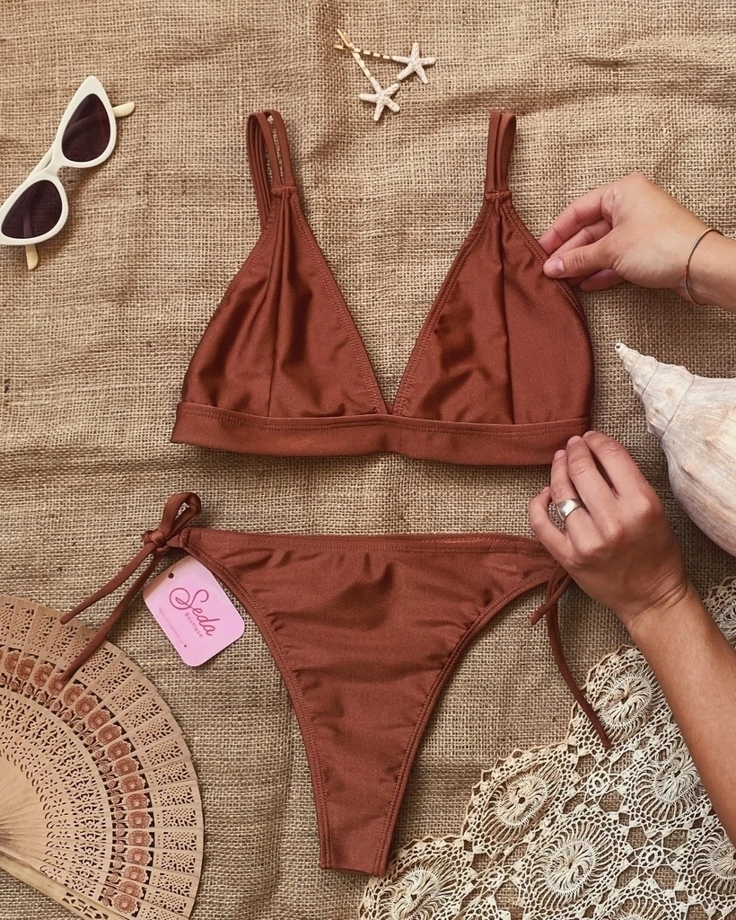 Bombacha con corte vedetina, con tiritas para atar en sus laterales. Confeccionada en lycra metalizada, con protección UV +50. Tiro medio/alto. Forrada integramente para mayor comodidad.